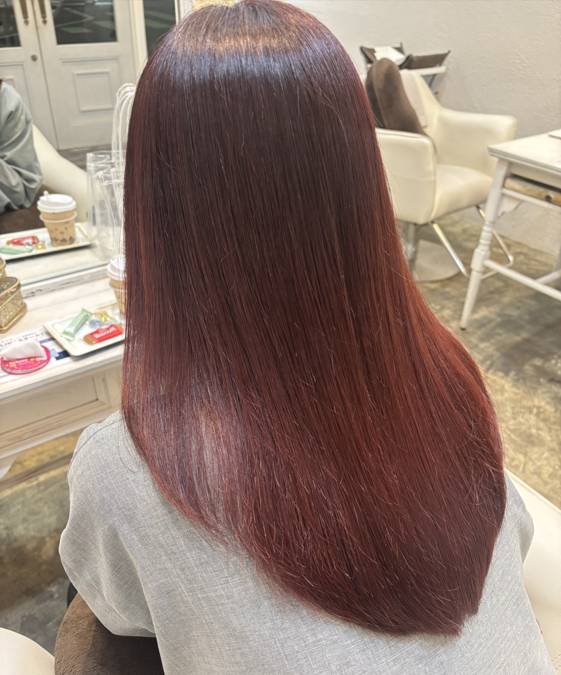 今回はイルミナカラーのブロッサムと赤みをたせるカラー剤を混ぜて染めさせていただきました!