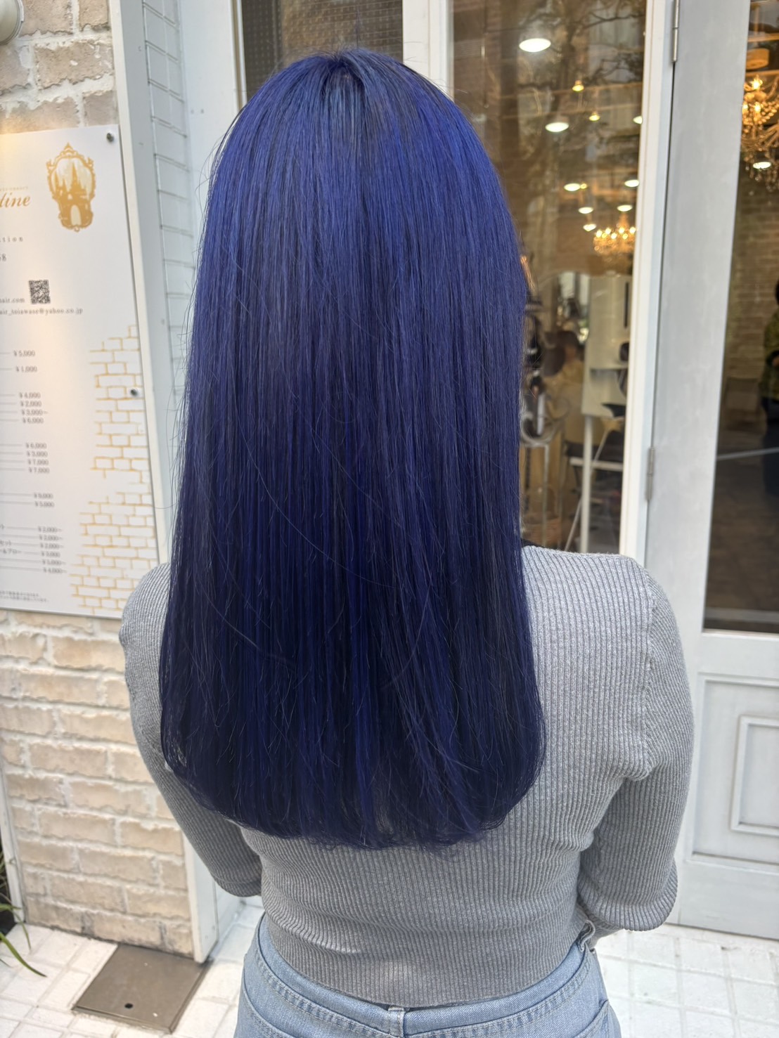 今回はブリーチ2回の髪に濃い青色をお入れしたのですが、紫を足して、色落ちが緑にならないようにカラーさせていただきました!